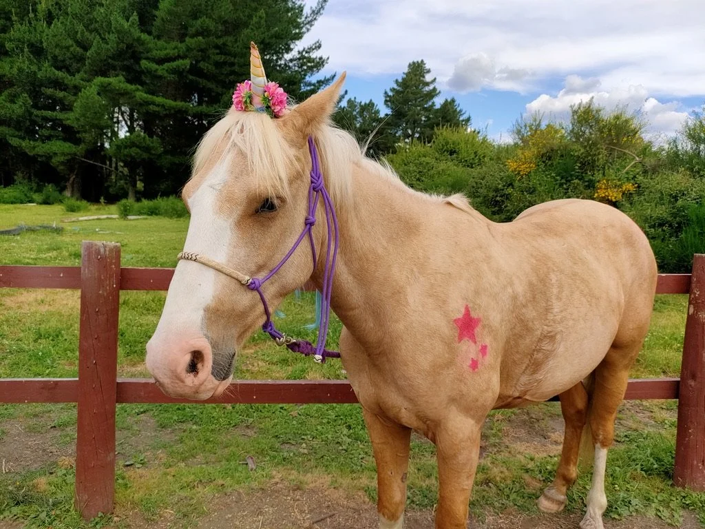 Te Karu is named after his eye. Te Karu was found on his own and with an injury down his face from an unknown cause out in the wild. We helped him heal and recover and fortunately, while it may look like his blue eye might be blind, he still has vision in it. Since then, he has become a part of our herd and an integral part of our trekking team. Nicknamed TK, which is easier for children to remember, he is perfect as a beginner riders horse or for children to explore riding on their own off the lead-rein.